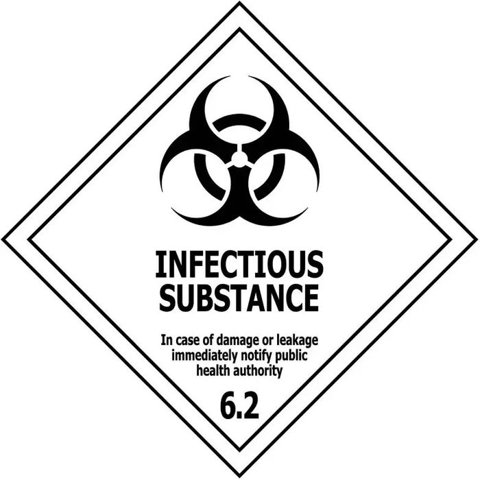 Wording reads Infectious Substance - In case of damage or leakage immediately notify public health authority 6.2