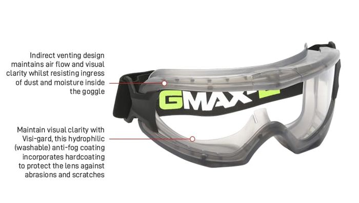 Indirect venting design maintains air flow and visual clarity whilst resisting ingress of dust and moisture inside the goggle