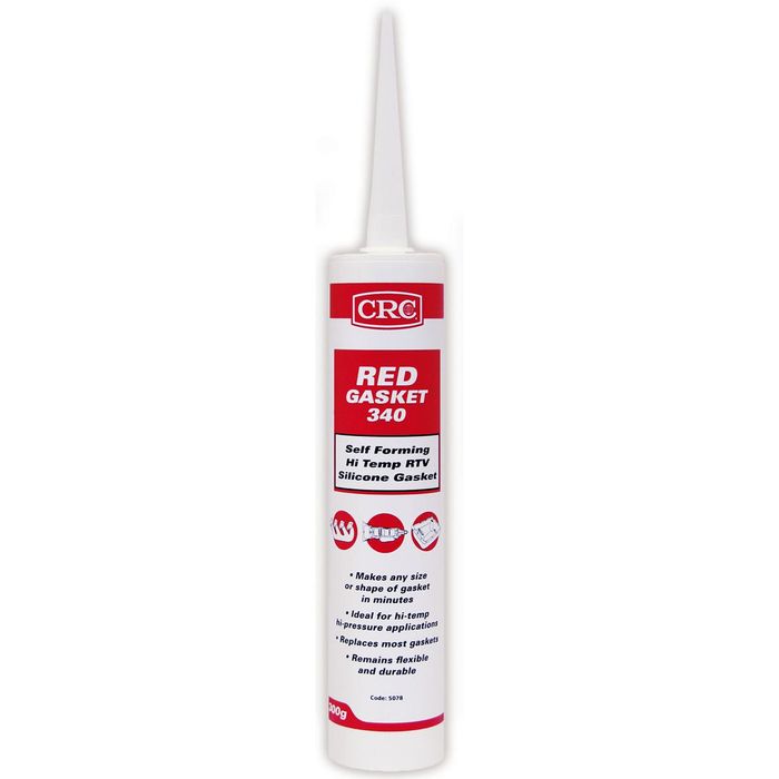 CRC Red RTV Gasket 340 is formulated for heavy duty, high temperature applications with an intermittent service temperature of up to 176C. CRC Red RTV Gasket 340 is a self-forming room temperature vulcanising Silicone that replaces almost any cut gasket, felt, cork, paper, asbestos and rubber gaskets. No gasket sealers are required - the pure silicone rubber forms to any size and shape quickly. CRC Red RTV Gasket 340 resists migrating caused by thermal cycles, cracking, shrinking and vibration. It is ideal for high temperature, high pressure applications, it will remain flexible and durable. CRC Red RTV Gasket 340 is NOT recommended for use on copper and brass. Do not use as a head gasket, not suitable for stove pipes or in fireplaces. Uses: General machinery and automotive gasketing, Valve rocker cover, Timing chain cover, Thermostat housing, Transmission pan, Side cover plate, Water outlet/inlet, Water pump cover gasket, Intake manifold, Oil pan corner seals, Differential cover