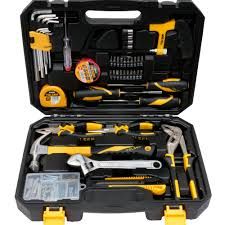 A comprehensive set containing good quality and most commonly used hand tools for repairs including combination pliers, long nose pliers, water pump pliers, claw hammer, adjustable wrench, screw drivers, measuring tape, insulated PVC tape, snap-off blade knife and nails set.