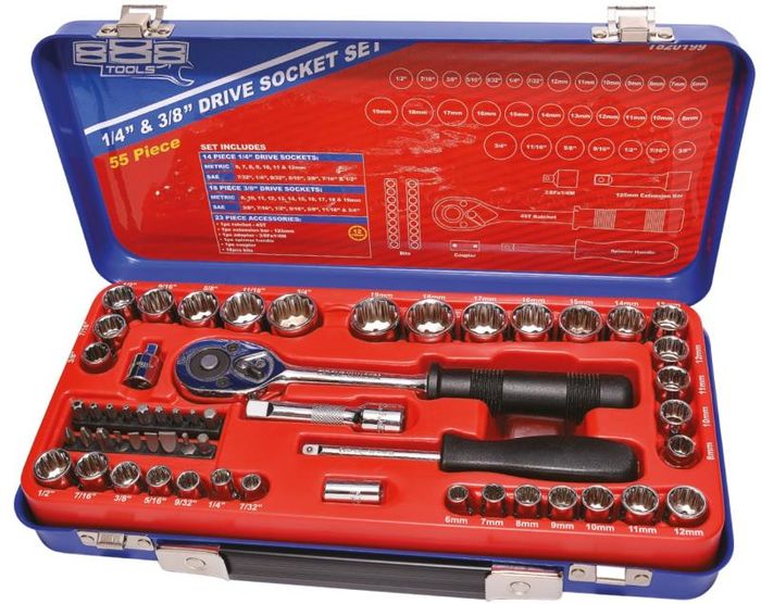 888 1/4"Dr & 3/8"Dr Socket Set - 12pt Metric/SAE - 55pc